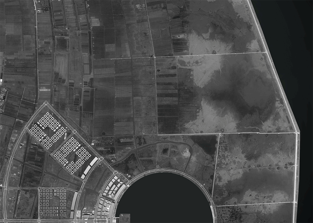 临港是中国“十一五”规划中“1966”大上海发展战略的一部分,位于长江三角洲入海口的农垦区;2020年将有80万常住人口。在最初的规划方案中,乡村的原始风貌被完全忽视 ------ 当地建筑和自然风貌消失殆尽,原先依运河而建的线性村庄的独特肌理彻底丧失,取而代之的是单一功能的巨大分区和高度几何化的千篇一律的空间格局。单一区划和低密肌理严重增加了单位面积的城市化成本。机械刻板的几何化设计缺乏灵活性,城市在全部建成之前丝毫无法运转,基础设施则被迫要在开发起初全部建成。不仅如此,在环境方面,围海造田会极大影响到当地的水文系统,盐沼地的生态环境被破坏,排水受阻,也预埋了潮汛期爆发洪水的隐患。
