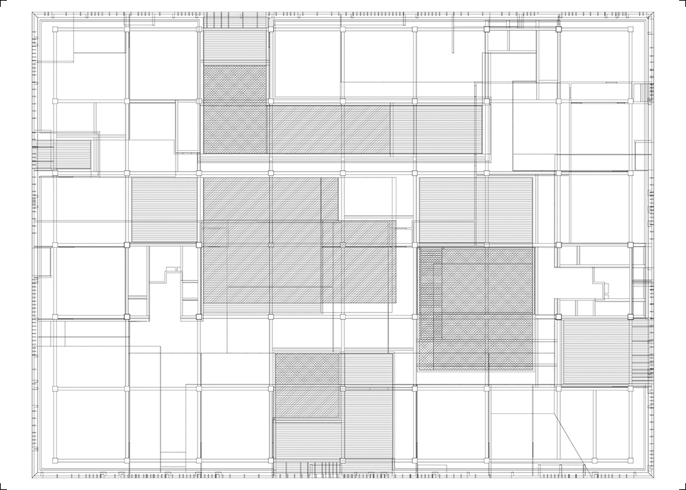 在与邻接的城市肌理和现有的步行网络系统建立微妙连接的同时,建筑的内部空间也产生了多样性变化。功能与楼层被布局和“侵蚀”成不同程度的通透空间,造成了一种独特的、意料之外的虚实互文的效果,使僵硬呆板的空间得到一种前所未有的释放,这一切又完全是在一个10x10m柱网这一最简单经济的结构体系中实现的。