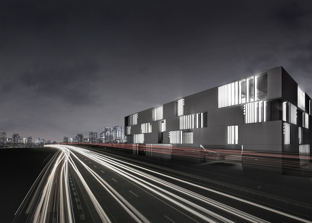 Our intervention tries to soberly resolve the client's will to create an iconic (though low-budget) building, avoiding pretentious and unjustifiable moves. Having to deal with the scarcity of money and time availability for its construction, we started the design from the simplest structural system of a box, articulating the facade and the interior spaces through processes of stratification and excavation. From the exterior, the mass of the building gradually loses its monumental integrity and the Euclidean volume gradually evolves into a permeable envelope, with big perforations on the facades and the roof, in which the internal programmatic organization plays a substantial compositional role. The rhythm of the external concrete blades loses its objective integrity becoming part of the street-scape, echoing and playing with the dynamism of the highway.